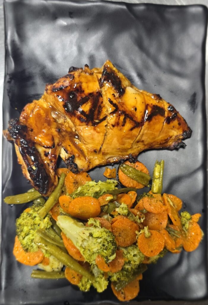 A quarter chicken grilled over a charcoal grill, topped with our signature sauce, served with a side dish.