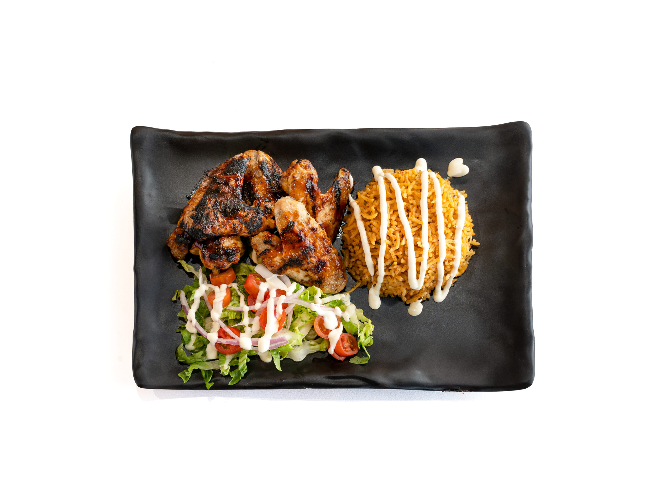 A quarter chicken, flame-grilled and infused with our signature spices, served with spicy rice and a generous assortment of mixed grills.