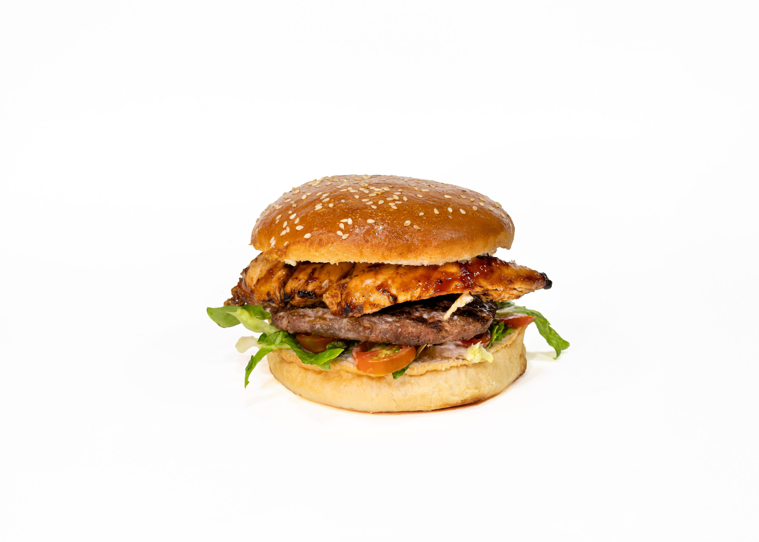 Succulent Peri Peri chicken fillet and flame-grilled lamb steak, layered with cheddar cheese and crisp salad leaves, served in a warm bun