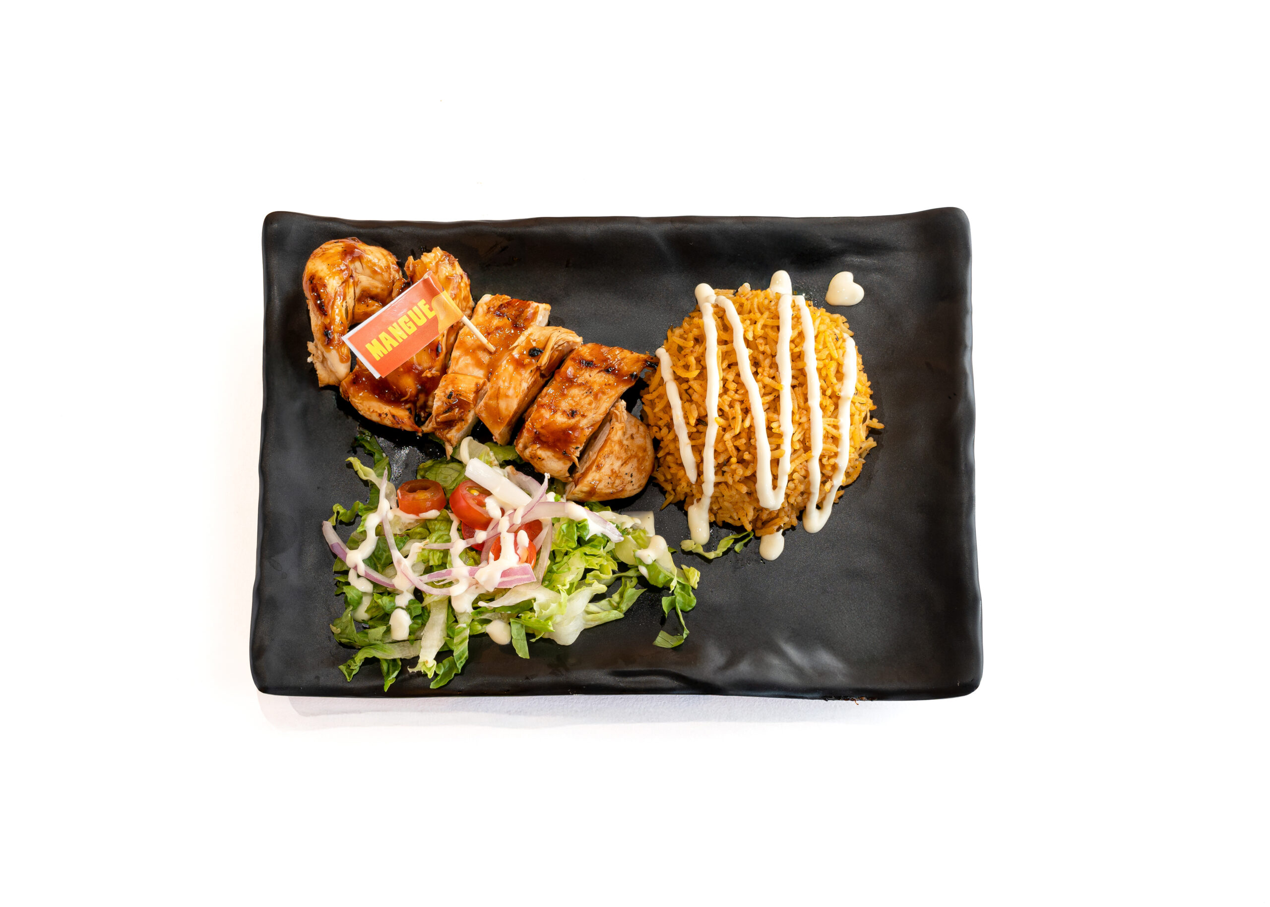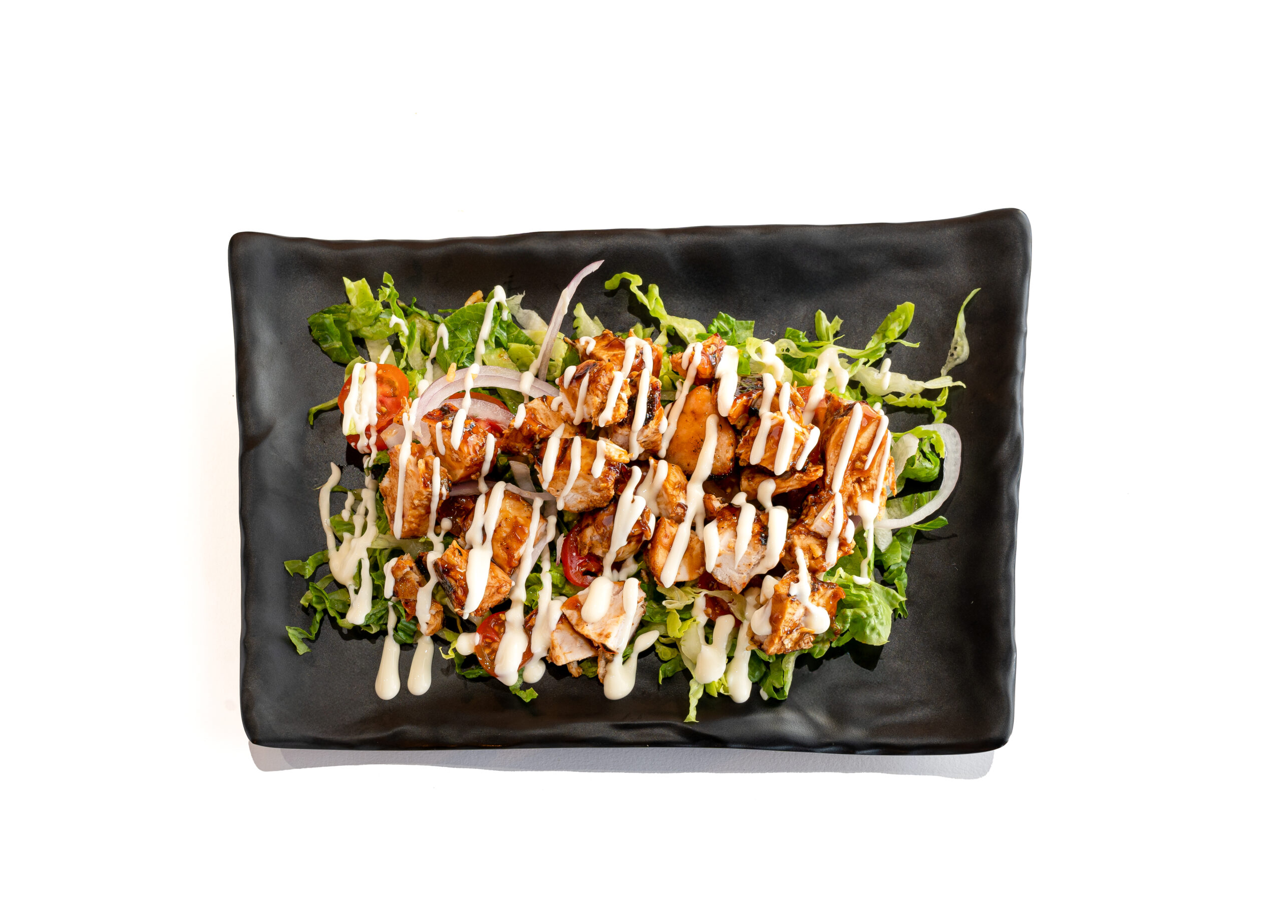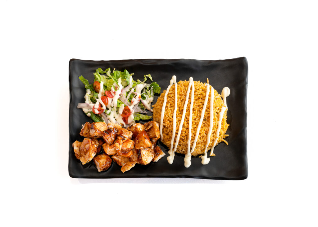Juicy chicken strips served over rice with a fresh salad, topped with a drizzle of mild mayonnaise.