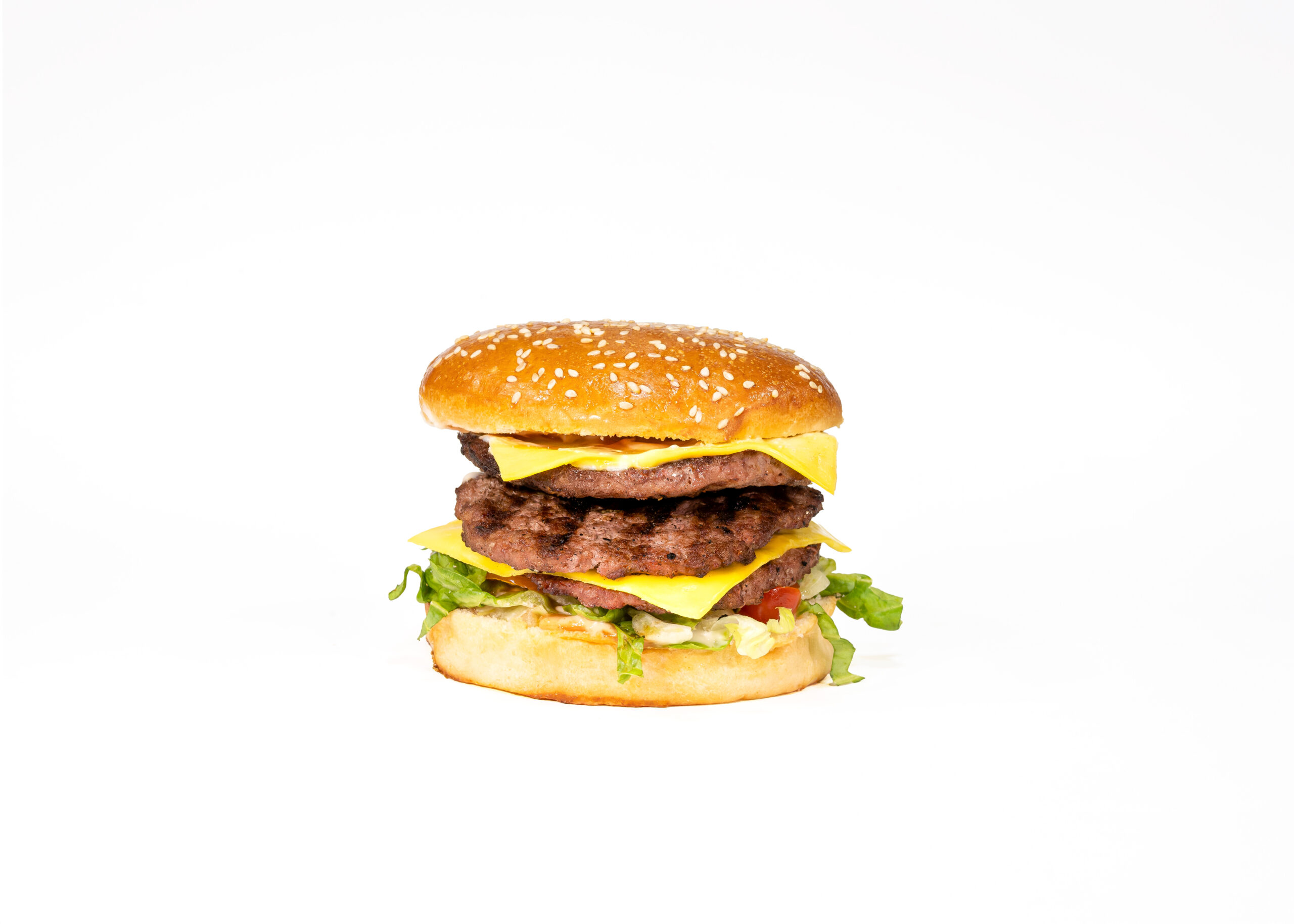 Three flame-grilled beef patties, stacked high, served with a fresh, crisp salad and creamy mayonnaise, served in a soft bun.